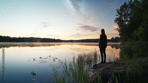 A person stands by a serene lake under a starry sky during dusk, surrounded by nature and water reflections.
