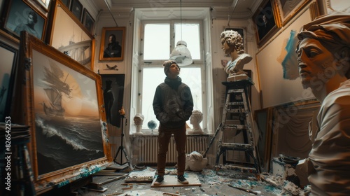 A person stands in an art studio surrounded by paintings and sculptures, creating an atmosphere of creative inspiration.