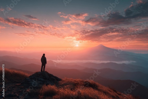 A person stands on a rocky outcrop at a mountain peak, enjoying a stunning sunset. Vibrant hues of orange and pink illuminate the sky, while fog rolls over the valleys below