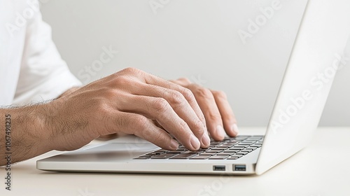 A Person Typing on a Laptop Keyboard While Seated at a Simple Desk During Daylight, Engaged in Focused Work or Study