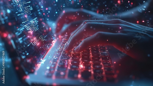 A person typing on their laptop, with digital data flowing out of the screen and glowing blue particles floating around them, representing technology. Generative AI.