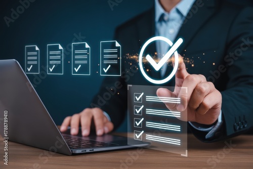 A person using a laptop with digital checklist and document icons on a dark blue background