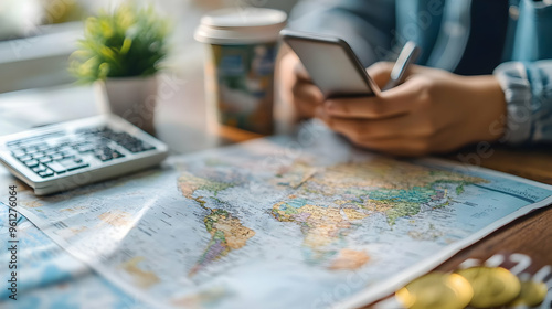 A person using a smartphone over a world map and coffee.
