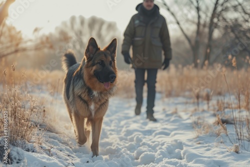 A person walking a dog through snowy terrain