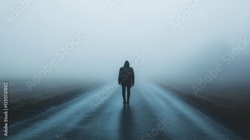 A person walking alone on a foggy road, shoulders slumped, deep in sorrow, --ar 16:9 --v 6.1 Job ID: 9a911b3f-447c-4513-a5ba-71ccd29a25f2