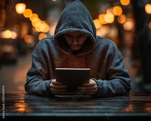 A person wearing a hoodie uses a tablet computer at night