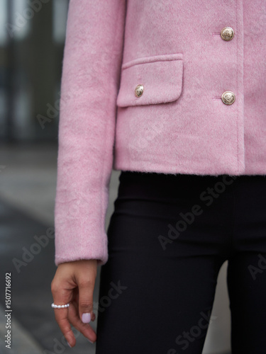 A person wearing a pink jacket with gold buttons and black pants. The hand, adorned with rings, rests casually by the side. The jacket features a flap pocket with a button