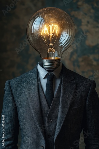 A person wearing a suit has a light bulb on their head, used for creative and humorous purposes