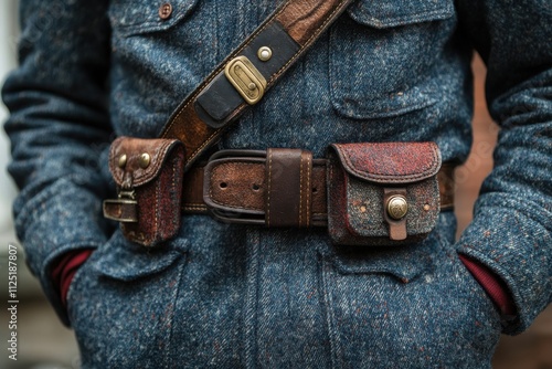 A person wearing a woolen coat with a belt featuring leather pouches.