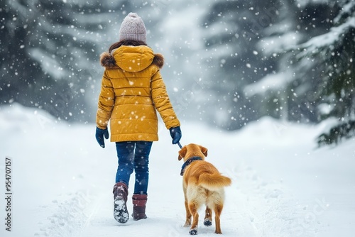 A person wearing a yellow coat and winter attire walking with their dog through a snowy forest, capturing a peaceful and vibrant winter scene, highlighting the joy of companionship.