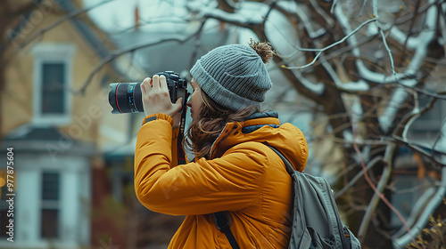 a person wearing a yellow jacket and a grey beanie, taking a photograph with a DSLR camera