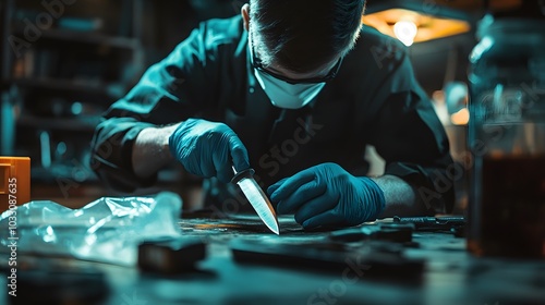 A person wearing blue gloves carefully examining a knife on a table.