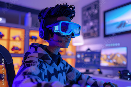 A person wearing headphones and goggles is playing a video game