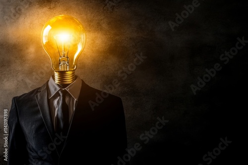 A person with a light bulb on their head wearing a dark suit embodies ideas and creativity.