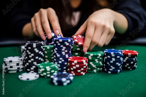 A person with a winning hand in blackjack, poker game in casino banner