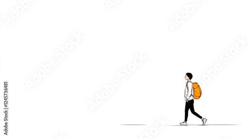 A person with an orange backpack walking in a minimalist urban setting with a plain background