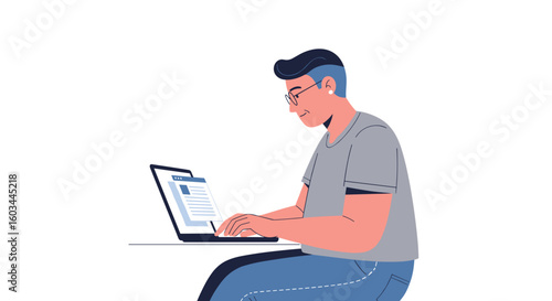 A person with blue hair and glasses is working on a laptop while sitting on a chair in a well lit room