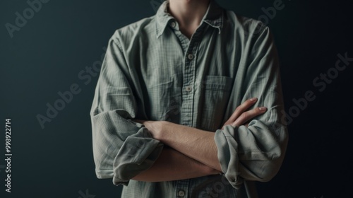 A person with crossed arms clad in a rolled-up sleeved green shirt, projecting a sense of casual confidence and readiness against a dark background.