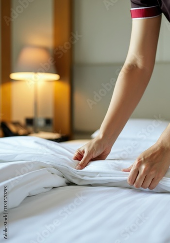 A person with light skin and short hair adjusts white bed linens in a hotel room. The soft lighting creates a cozy atmosphere. The focus is on hospitality and cleanliness.
