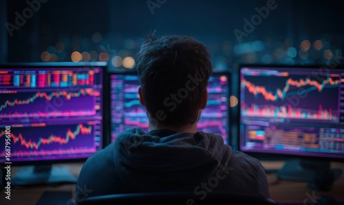 A person with multiple monitors showing stock charts at night. City lights are visible in the background