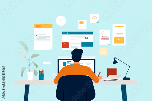A person working at a desk with a computer, surrounded by digital notes and a plant, creating a productive workspace atmosphere.