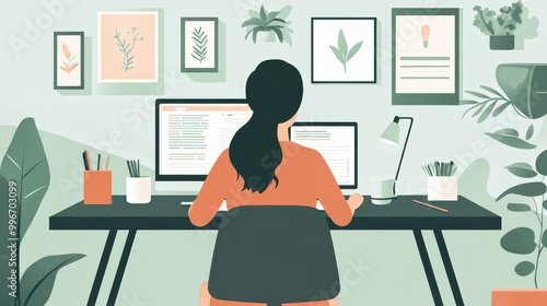 A person working at a desk with plants and artwork in a cozy home office during a productive afternoon