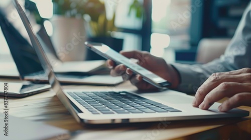 A person working on multiple devices, surrounded by digital technology