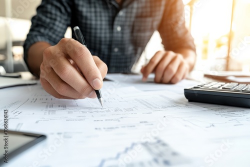 A person writes intently on a piece of paper surrounded by financial charts and documents, exuding an atmosphere of analysis and meticulous planning in an office.