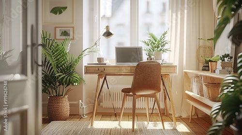 A personalized freelancer's nook with a sleek desk, an ergonomic chair, and a few personal decor items, featuring a laptop, a cup of tea, and some plants,