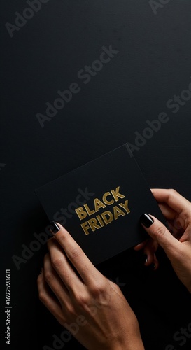 A person's elegant hands with dark manicured nails gently hold a black card featuring prominent gold "BLACK FRIDAY" text, set against a deep, dark background with ample copy space.