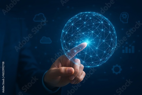 A persons finger touches a glowing digital sphere, representing technology, network, and global connection in a futuristic and innovative concept