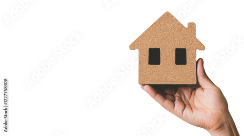 A person's hand gently holds a small, brown, cork model of a house against a black background.