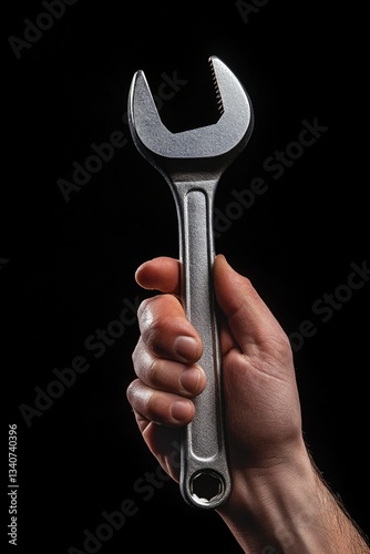 A person's hand holds a wrench against a dark background, suitable for use in mechanic or DIY themes