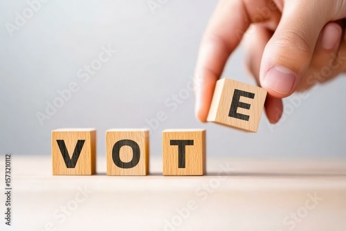 A person's hand is placing a wooden block with the letter E to complete the word VOTE, symbolizing the importance of participation in elections and civic engagement.