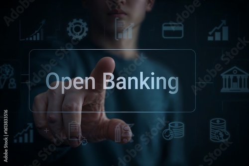 A person's hand touches a virtual screen with the words Open Banking. A concept for financial technology, data sharing, and digital innovation.