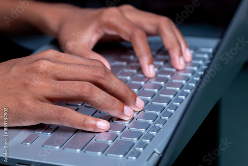 A person's hands are typing on a laptop keyboard.