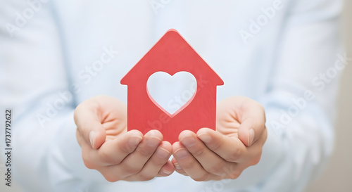 A person's hands holding a red wooden house with a heart-shaped cutout, symbolizing a loving home.