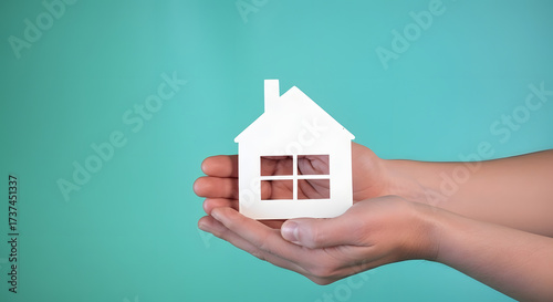 A person's hands holding a white model house against a solid teal background.