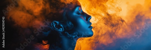 A person's profile with vibrant orange and blue smoke swirling around, creating a dramatic artistic effect.