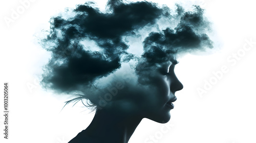 A person’s silhouette with a dark storm cloud swirling inside their head, symbolizing anxiety. Anxiety cloud.