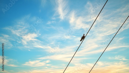 A pet pigeon sits and rests against a blue sky. in high resolution Blue sky background.