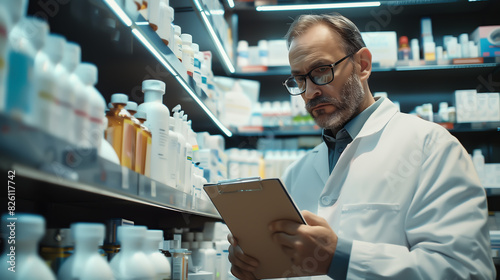 A pharmacist checks a clipboard in a pharmacy. The careful work of managing a pharmacy. Generative AI.