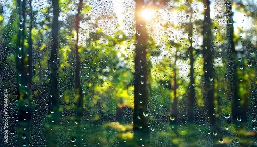 a photo art of water droplets on glass in the woods with beautiful bokeh and reflections
