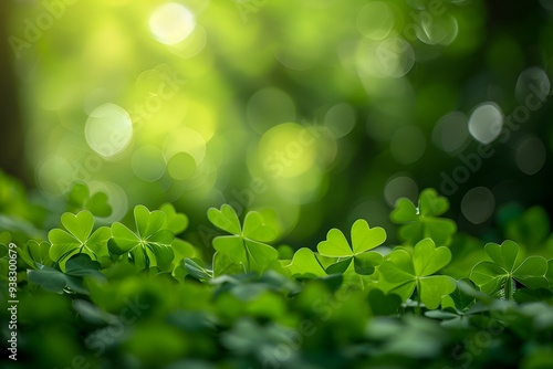 A photo blur of a natural green abstract background with leaves, themed for Saint Patrick's Day. The blurred effect creates a festive and immersive atmosphere