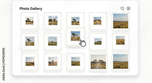 A photo gallery interface displaying landscape images, with a cursor selecting one of the photos.