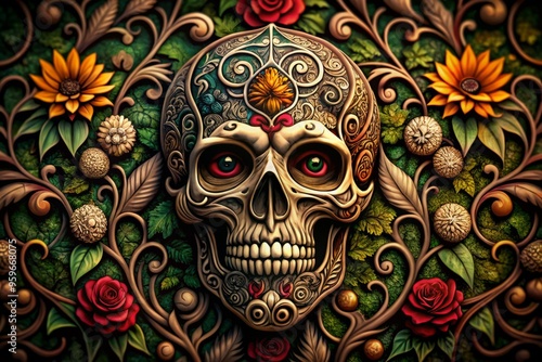 A photo image of a traditional tattoo skull with a bold outline, ornate filigree, and a menacing expression, surrounded by vines and flowers