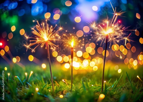 A photo image of whimsical sparklers on a warm July evening, surrounded by vibrant green grass, twinkling lights, and a burst of colorful fireworks in the background.