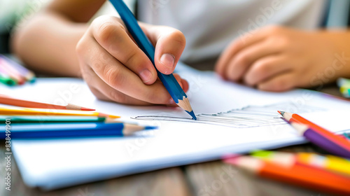 A photo of a cute boy character drawing white paper by a little child using crayons on a wooden table