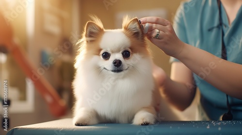 A photo of a groomer finishing a pets haircut.