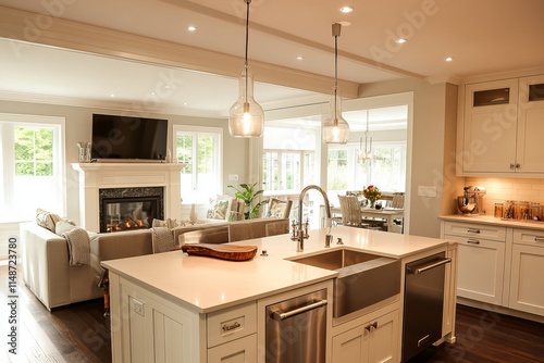 A photo of a large, modern kitchen with white cabinets and a light grey island, stainless steel appliances, a farmhouse sink, hanging lights, an open concept to the living room in the background,